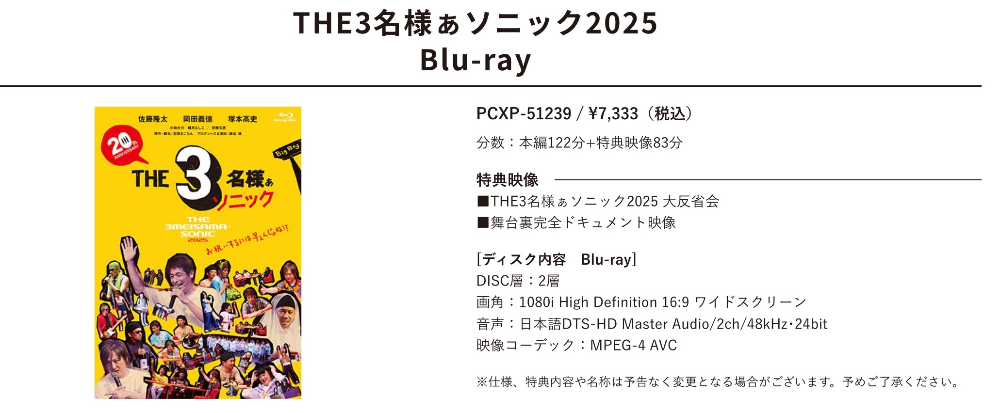 「THE3名様ぁソニック 2025」Blu-ray発売決定!